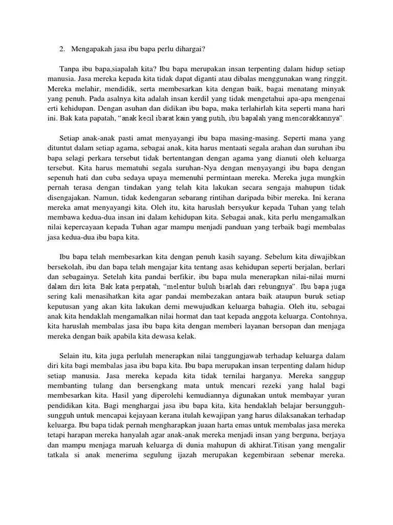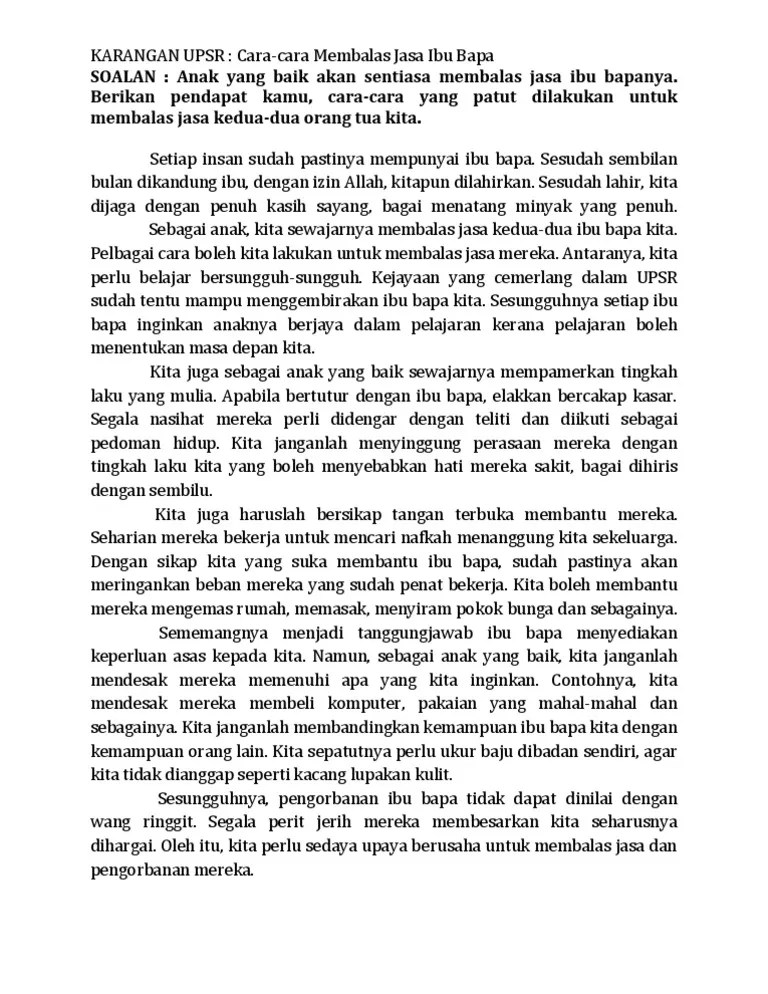 Contoh karangan cara mengenang jasa ibu bapa jasa ibu bapa kita tiada tandingannya maka janganlah kita sesekali mengabaikan ibu bapa. Kita hendaklah membalas jasa baik mereka. Kisah si tanggang yang semakin mewarnai . Ibu bapa merupakan insan yang banyak berjasa kepada kita. (menulis secara imlak perkataan dan frasa). Pengorbanan ibu bapa kepada kita sangat besar dan tidak dapat dinilai dengan wang ringgit. Justeru, kita mestilah membalas jasa ibu bapa. Ibu ialah orang yang melahirkan kita manakala bapa orang yang mencari . Jika dikira jasa ibu bapa, pasti ia takkan terbalas. Adakah dengan ungkapan sahaja sudah menunjukkan kasih dan . Mudah untuk mengatakan saya sayang ibu dan ayah saya.
