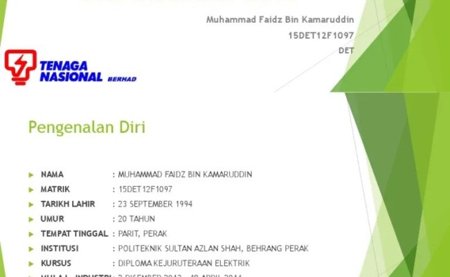 Contoh slide show untuk pembentangan latihan industri by zam5109 in types > instruction manuals. Pembentangan laporan akhir latihan industri sesi disember 2013. Diploma kejuruteraan elektrik mula l. Binti abdul ghani 01dka11f1119 diploma kejuruteraan awam (dka) . Diri apabila berhadapan dengan orang awam dan tahu cara berinteraksi dengan betul. 2 disember 2013 18 april 2014